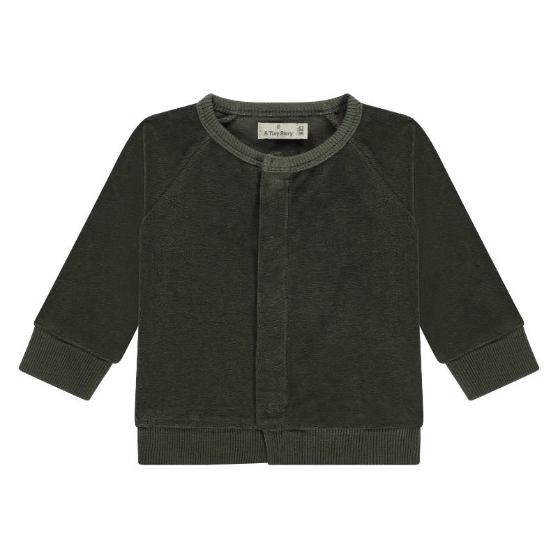A Tiny Story baby cardigan Basil. Lief babyvestje van fluweel biologisch katoen van A Tiny Story. Je shopt hier de hele A Tiny Story collectie bij Little Department Store.