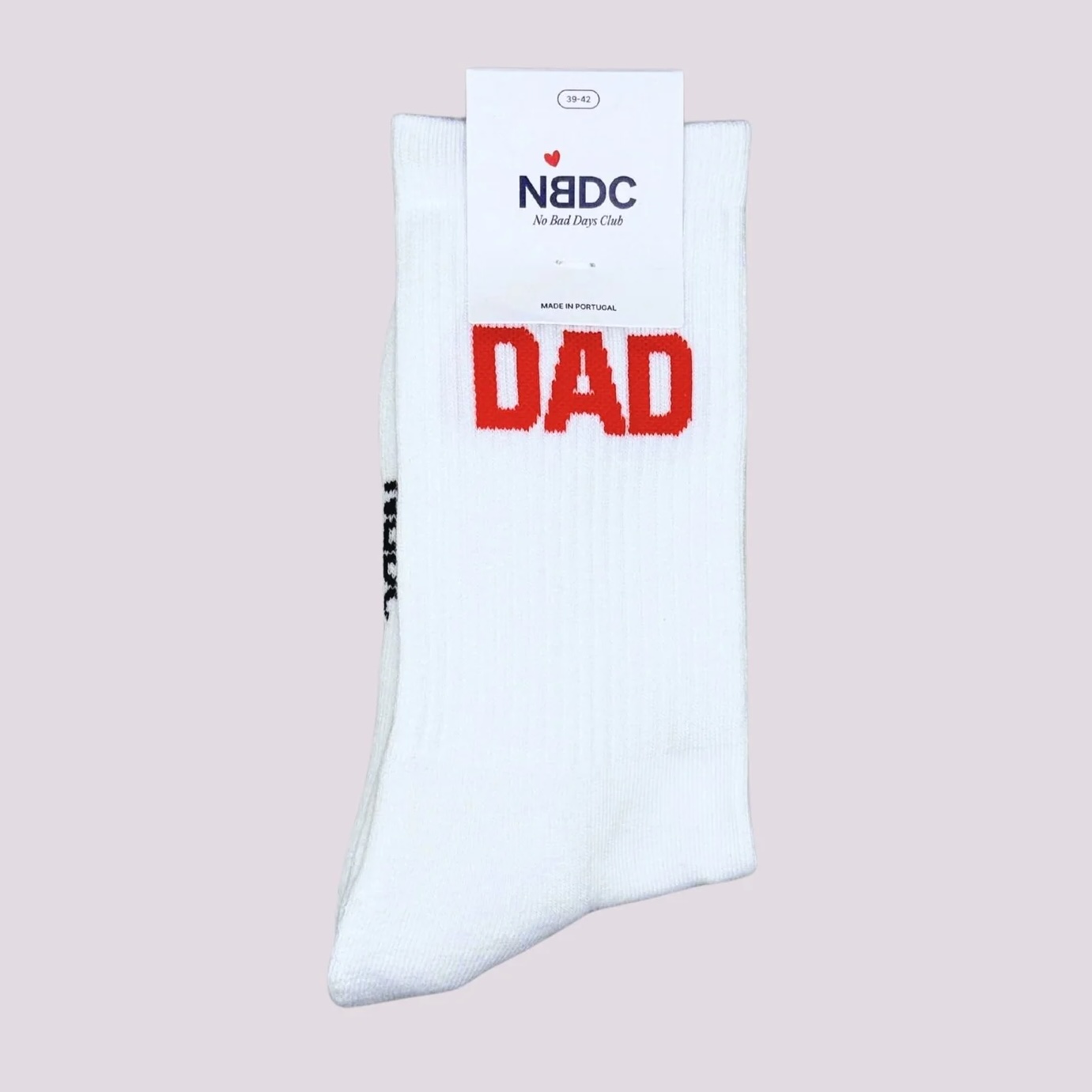 NBDC DAD Sokken rood. Te leuk: Superleukewitte sportsokken met DAD erop. Superleuk om cadeau te geven aan kersverse ouders. Gemaakt met zachte biokatoen, perfecte pasvorm en hoogwaardige afwerking in Portugal.
