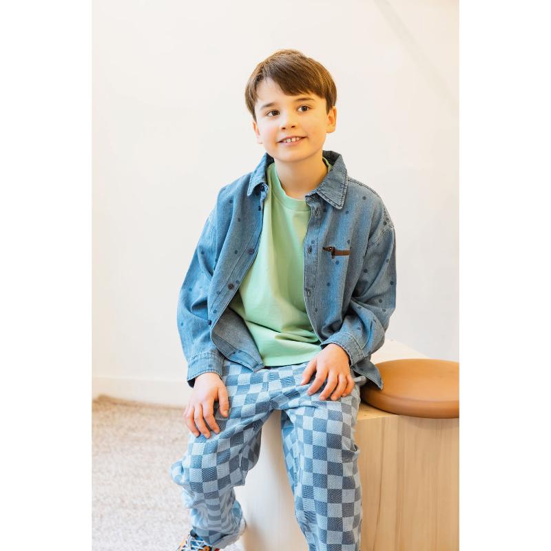 Leuke set bestaande uit een denim shirt met teckel van Mini Rodini. Eronder een groen shirt van Main Story op een lange geblokte denim broek van Nixnut. Hieronder vind je alle items die op de foto staan. Hopelijk is je maat nog op voorraad!