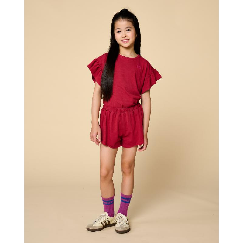 Petit Blush Bella Ruffle Tee Garnet. Leuk shirt met ruffle mouwtjes. Deze matcht natuurlijk perfect bij de rest van de Petit Blush collectie. Je shopt hier de hele Petit Blush collectie bij Little Department Store.