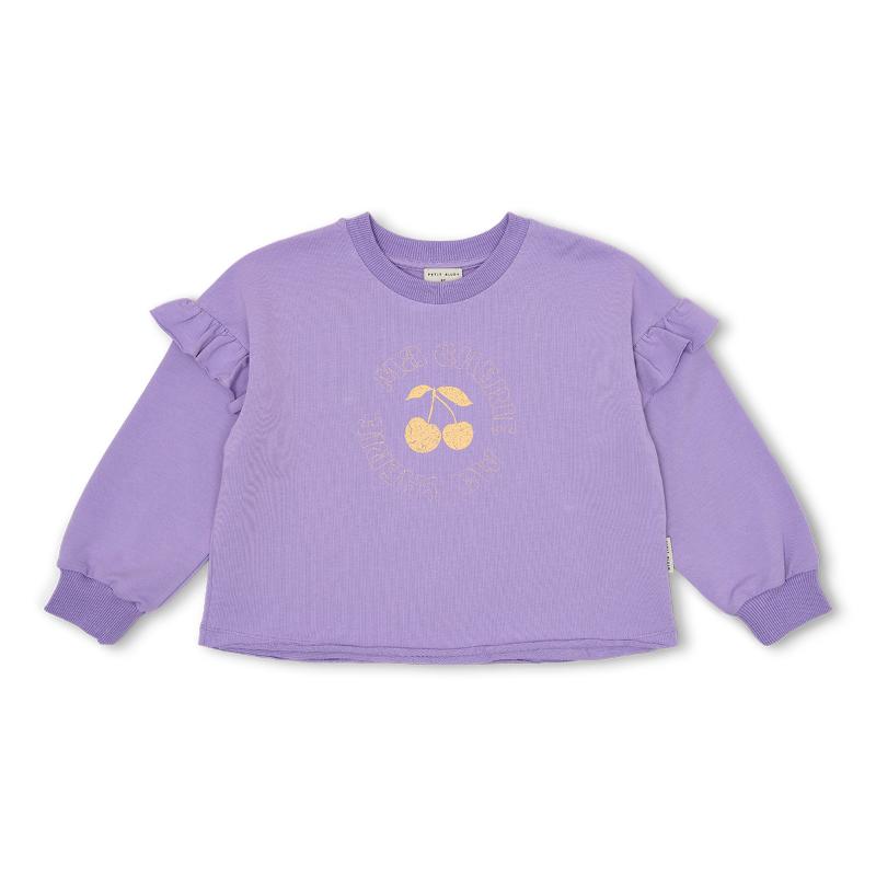 Petit Blush June Ruffle Sweater Chalk Violet. Perfecte lila sweater met kersen printje. Deze matcht natuurlijk perfect bij de rest van de Petit Blush collectie. Je shopt hier de hele Petit Blush collectie bij Little Department Store.